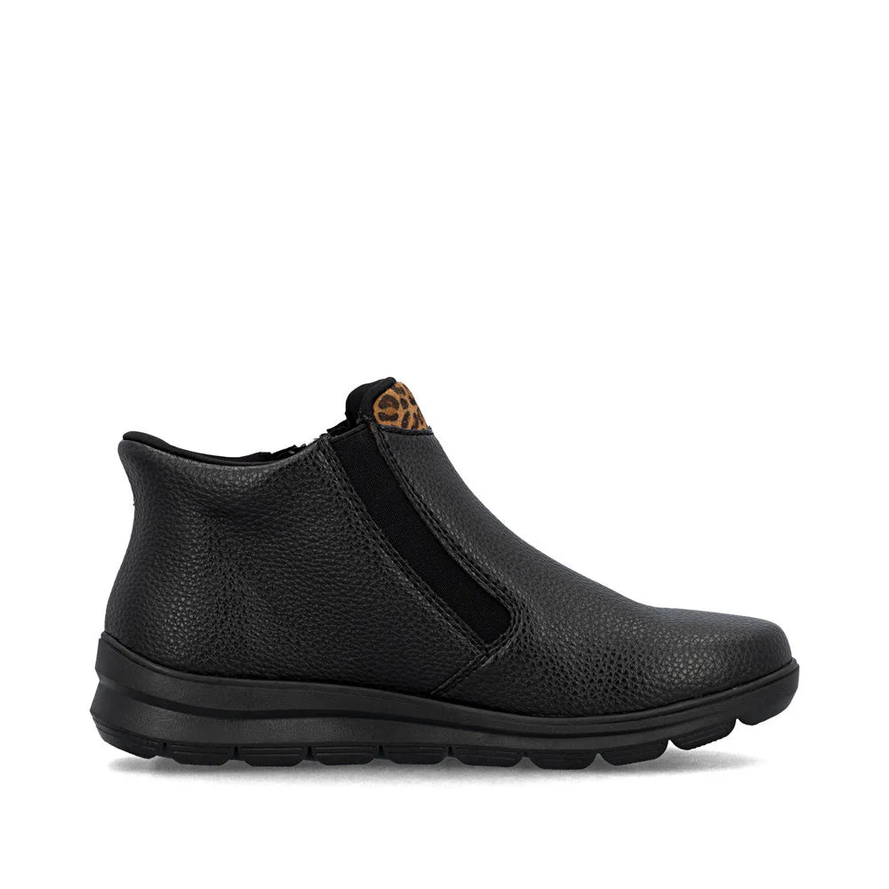 Stylish and comfortable through the cold season! This Rieker ankle boot in black is the true definition of a practical slip-on shoe! The zipper makes the shoe easy to put on and take off. The leopard print is a real eye-catcher. The grippy sole gives good traction at every step. Thanks to the padded and removable insole, optimal comfort is a given. The water-repellent RiekerTEX membrane provides reliable protection from the wet, while the Ready2GO feature ensures quick and easy donning. With its super soft and warm lining, the cold doesn't stand a chance. Well-being for your feet - with Rieker!