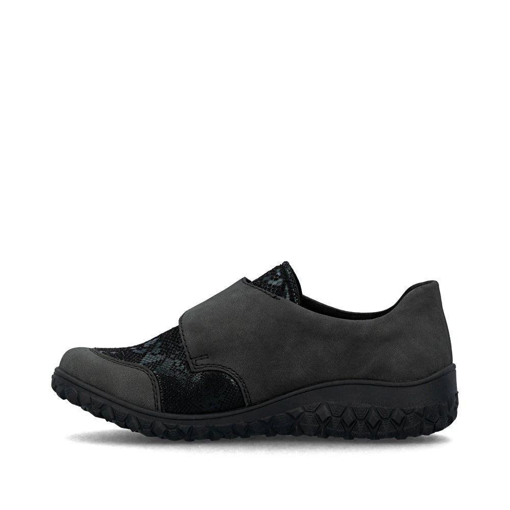 The Rieker 59552 Women's Strap Shoe in grey combines simplicity and practicality in one comfortable package. Designed with a synthetic leather upper and a hook-and-loop fastener, this wide-width shoe allows for quick and easy on and off. The lightweight, grippy sole ensures stable footing for everyday wear. Featuring a padded, removable insole, it provides long-lasting comfort and support throughout your day. With extra width for added room, this shoe is ideal for those seeking both style and function in a casual design.