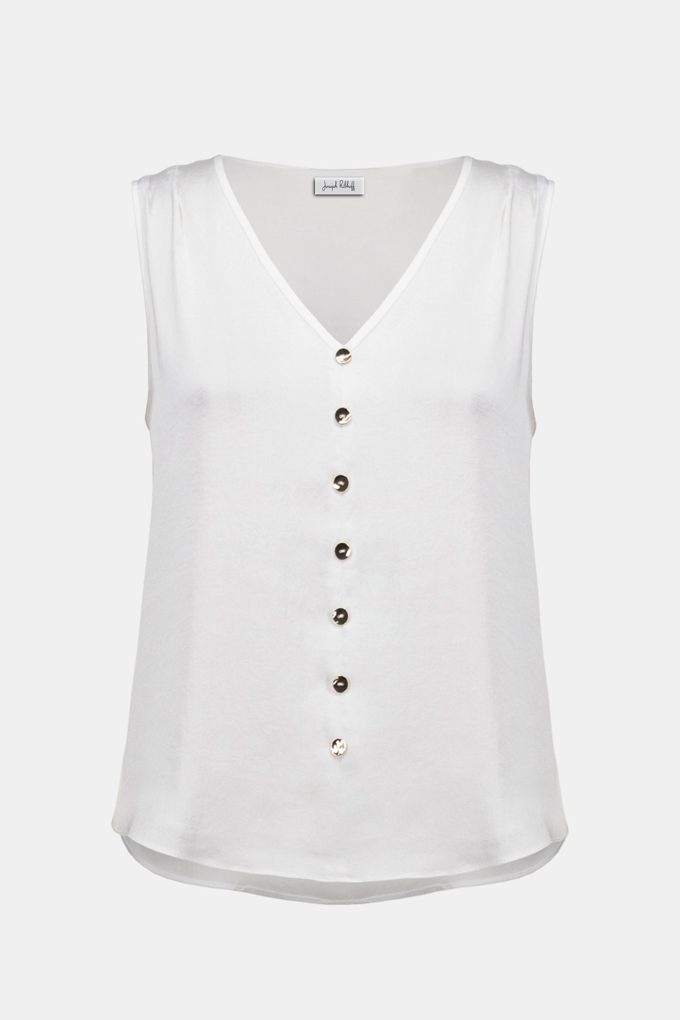Lustrous and lightweight, this recycled hammered satin top is designed with a refined V-neckline, soft shoulder pleats, and a row of gold buttons down the center front for a polished touch.