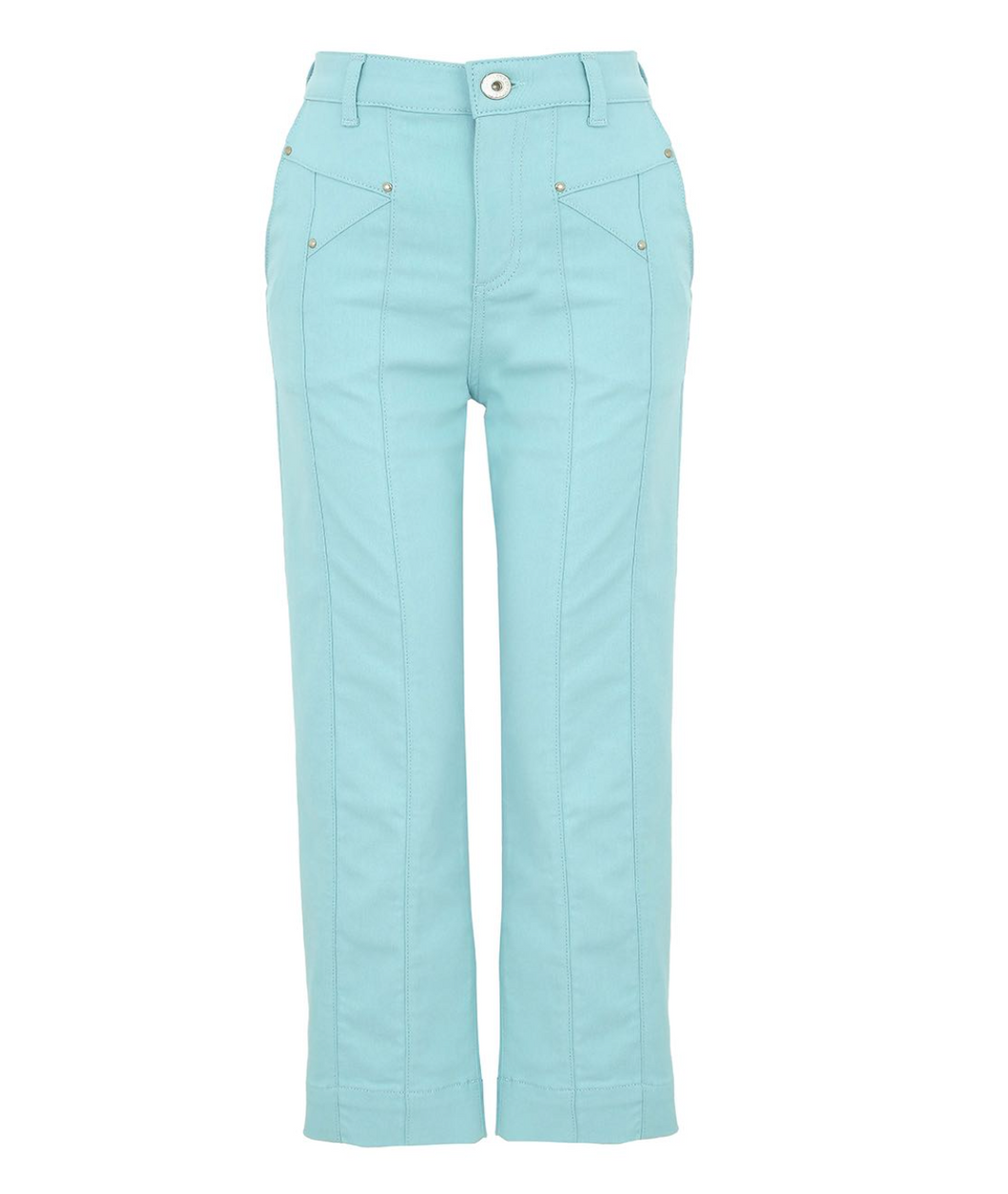 Dolcezza Pants “Le Sable Et La Mer” – exquisite cotton-blend capri ankle length slightly flared pants with front zipper, pockets, structured seams, fin aqua blue turquoise (“sea foam”) solid colour, woven fabric.